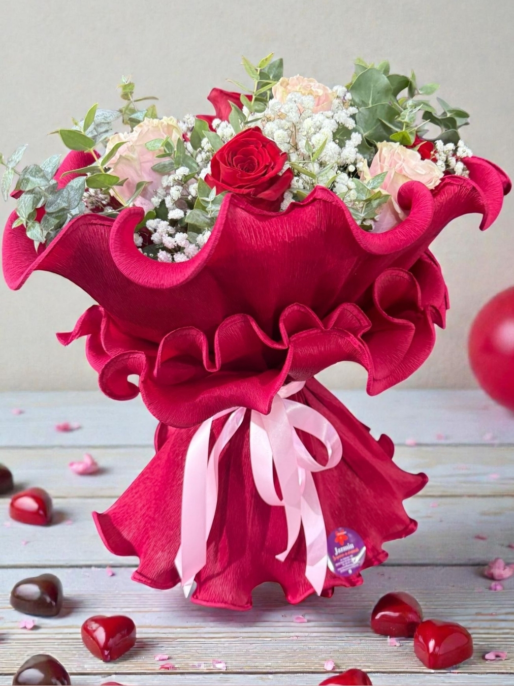 Las rosas rojas representan la pasión y el amor profundo, mientras que las rosas claras aportan ternura, dulzura y equilibrio. Todo envuelto en un acabado artesanal con papel rizado rojo y lazo en tonos suaves, pensado para impactar desde el primer vistazo.