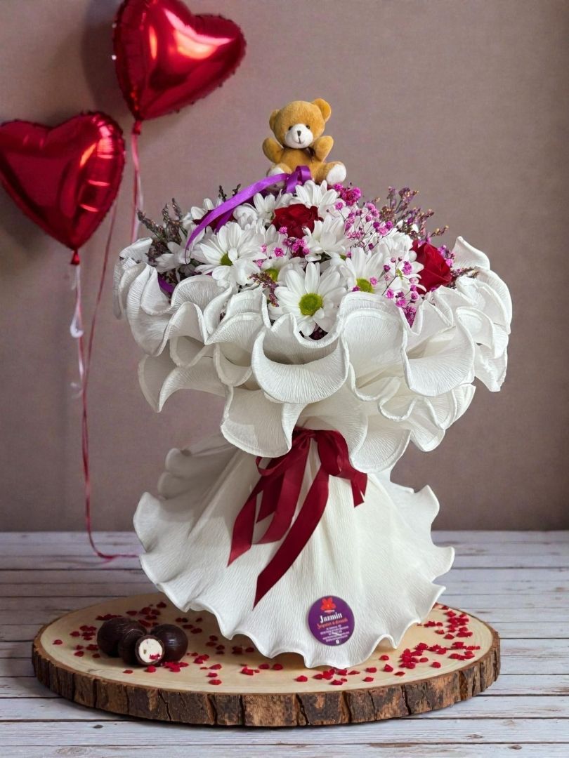 El diseño se presenta con un elegante envoltorio blanco de acabado ondulado, que aporta volumen y sofisticación, y un osito decorativo que suma un toque dulce y romántico, ideal para sorprender en San Valentín.
