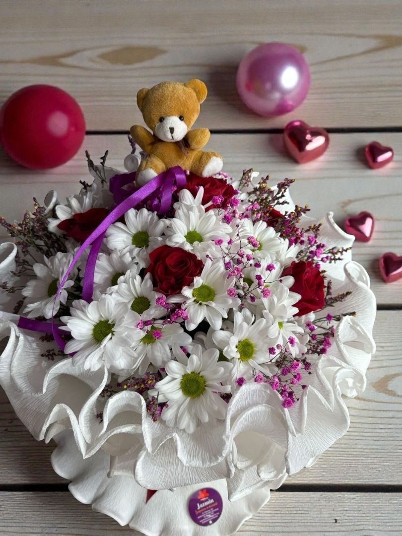 Esta creación combina rosas rojas intensas, símbolo del amor apasionado, con margaritas blancas frescas que aportan luz, ternura y equilibrio. El conjunto se completa con delicados toques de paniculata en tonos rosados y verdes naturales que realzan cada flor.