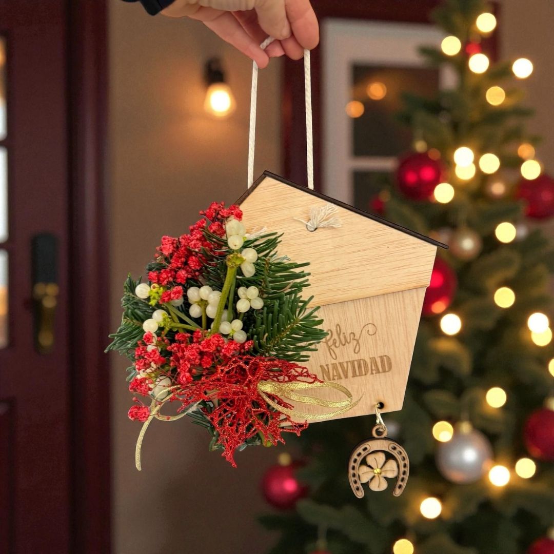 Nuestra Casita Muérdago de la Suerte es ese detallito mágico que transforma cualquier puerta o rinconcito en pura vibra navideña. La mezcla de muérdago blanco, ramitas verdes y flores rojas crea un contraste súper cálido y festivo, perfecto para atraer buena energía desde el primer vistazo.