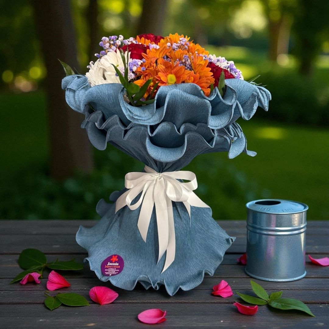 Su envoltorio azul con lazo blanco aporta el toque moderno que equilibra esta paleta intensa, creando un ramo elegante y lleno de vida. Perfecto para regalar gratitud, cariño o simplemente para llenar tu hogar de color y energía positiva.
