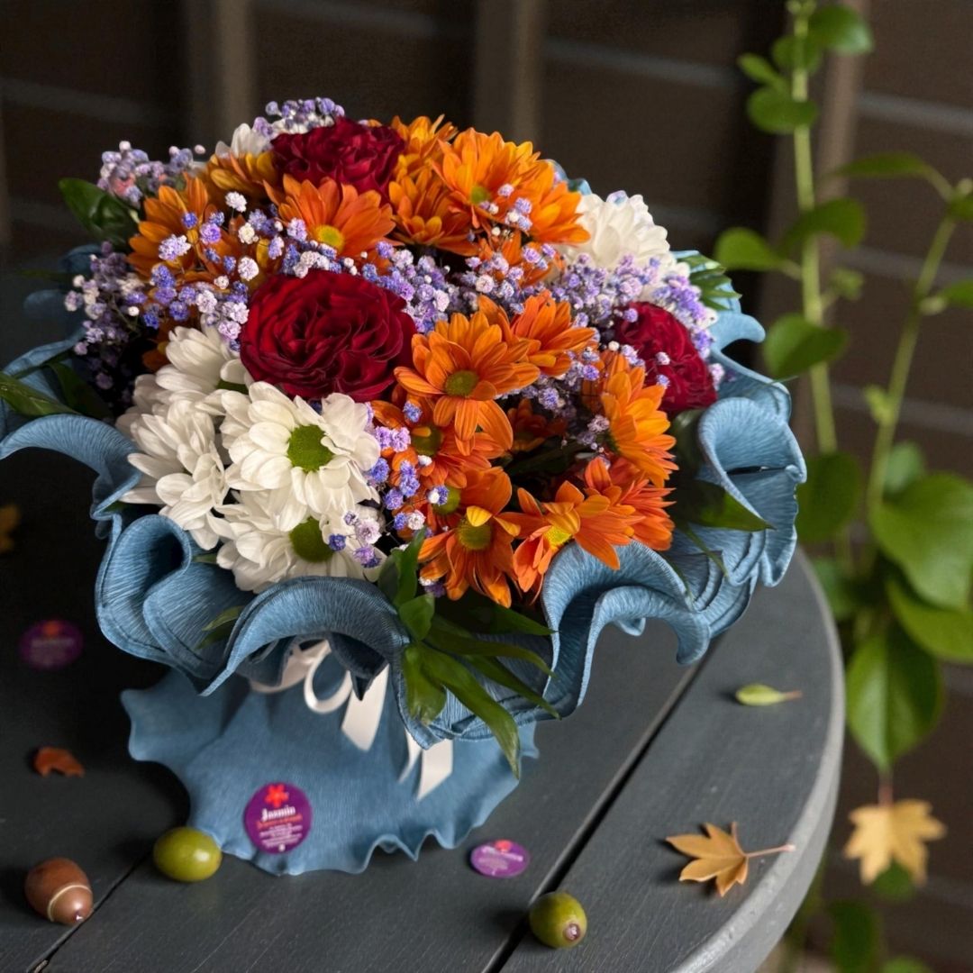 El Ramo Autumn Vibes celebra los tonos del otoño con una composición vibrante y equilibrada. Los crisantemos naranjas, margaritas blancas, flores lilas y rosas rojas se combinan para transmitir calidez, alegría y pasión.