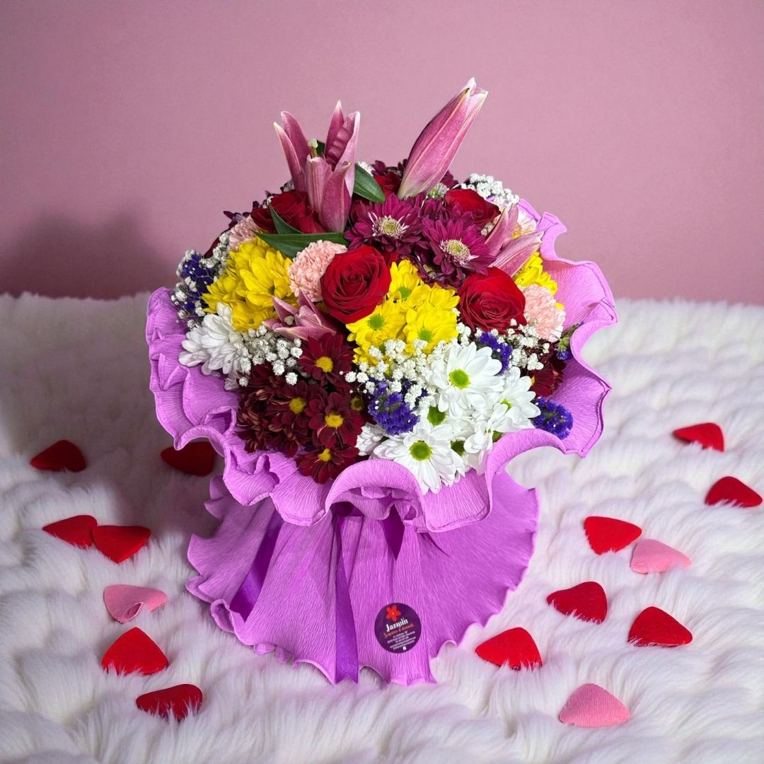 El Ramo Caleidoscopio es pura explosión de color y alegría. Cada tono se mezcla como en un mosaico vivo: rosas rojas intensas, margaritas blancas luminosas, crisantemos burdeos y amarillos vibrantes, acompañados por toques lilas y pequeñas flores en tonos malva. Un conjunto lleno de energía que cambia y sorprende desde cualquier ángulo, igual que un caleidoscopio.
