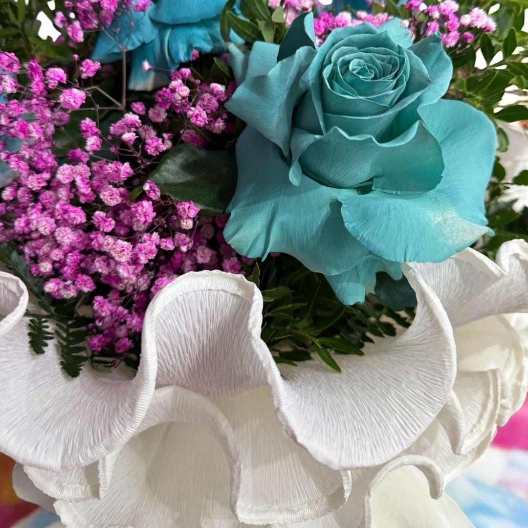 El Ramo Cielo Mágico combina la serenidad del azul con el encanto del fucsia en una composición única y moderna. Sus rosas azules, acompañadas de paniculata rosada y follaje natural, crean un contraste elegante y cautivador. El envoltorio blanco con lazo azul realza su frescura y estilo contemporáneo.