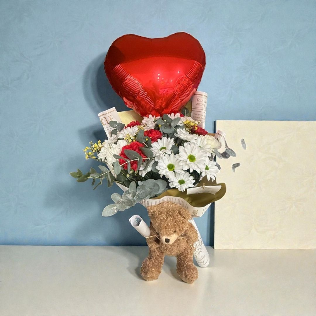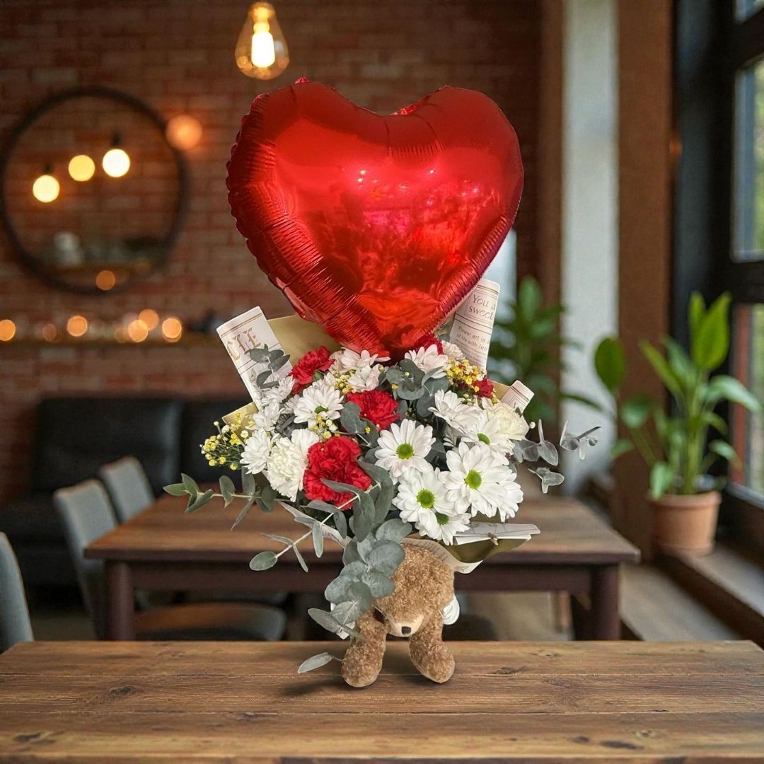 Un diseño lleno de amor: globo corazón, flores frescas en blanco y rojo y un adorable osito que sostiene un mensaje. Perfecto para sorprender a alguien especial.
