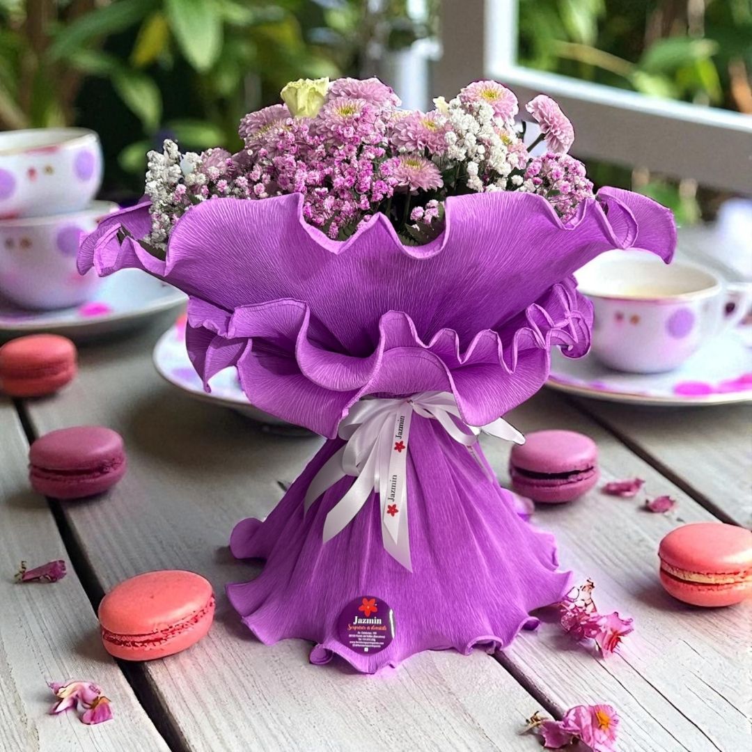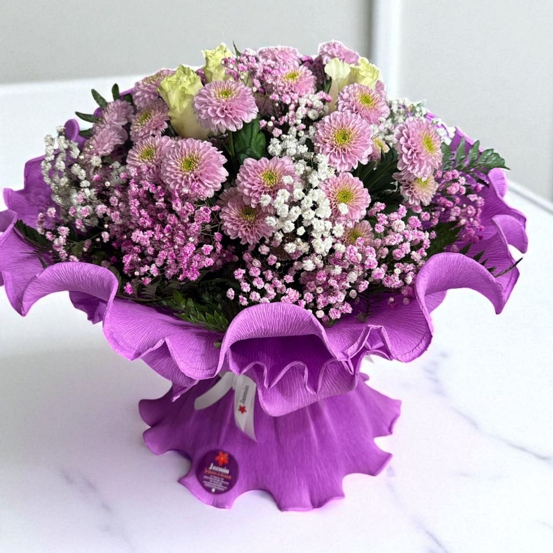 El Ramo Dulce Encanto combina la suavidad del rosa con la pureza del blanco, creando una armonía floral que inspira ternura. Sus crisantemos rosados, paniculata en tonos blanco y fucsia, y suaves rosas crema se unen en un diseño encantador, envuelto en papel lila con acabado artesanal.