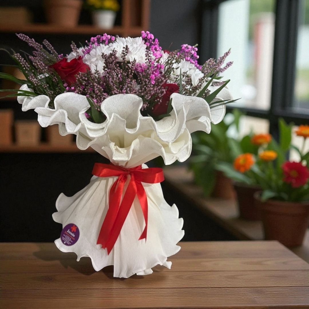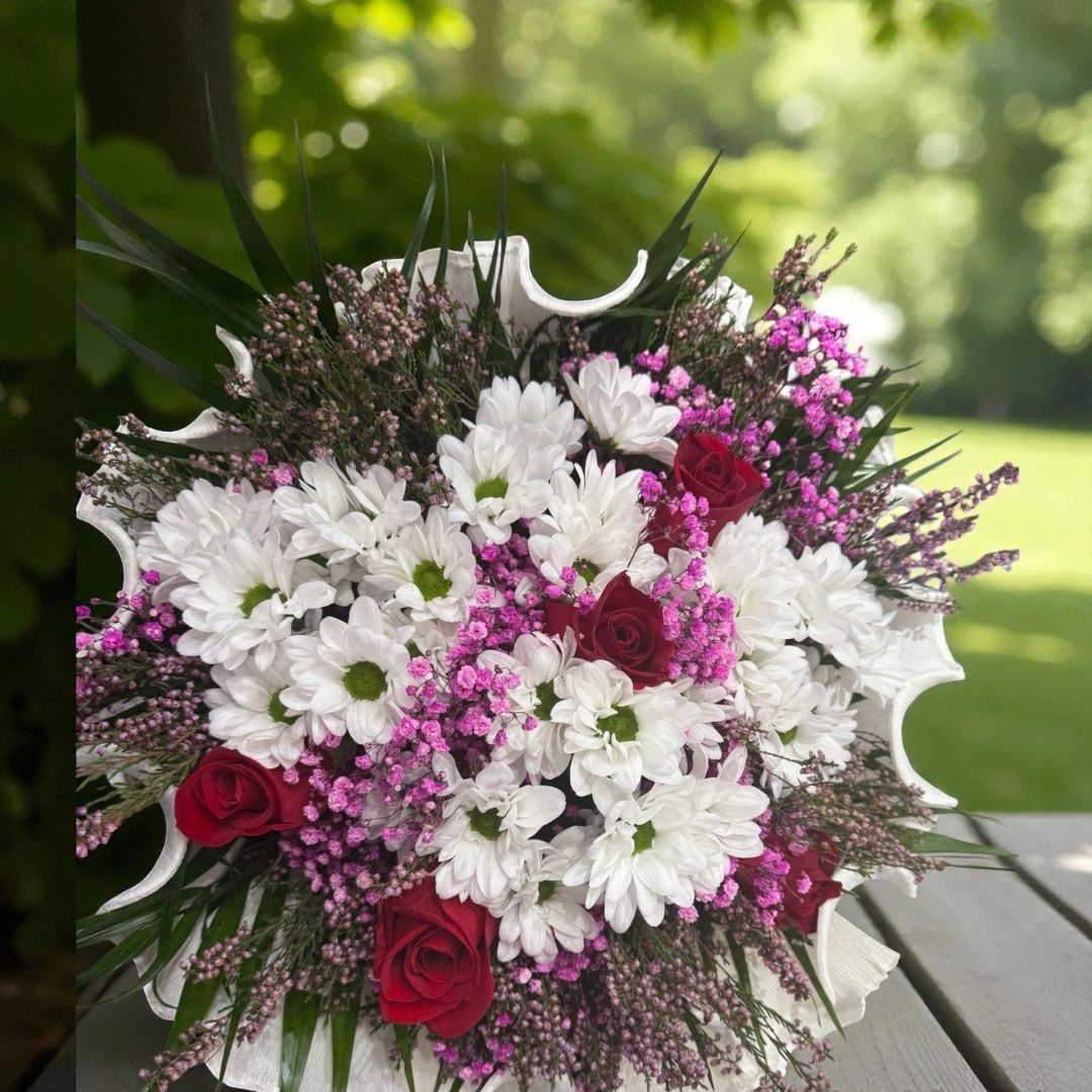El Ramo Encanto Puro combina la dulzura del blanco con la fuerza del rojo y el toque delicado del rosa. Sus margaritas blancas, rosas rojas y paniculata rosa crean un contraste precioso que transmite cariño, ternura y elegancia en un solo vistazo.