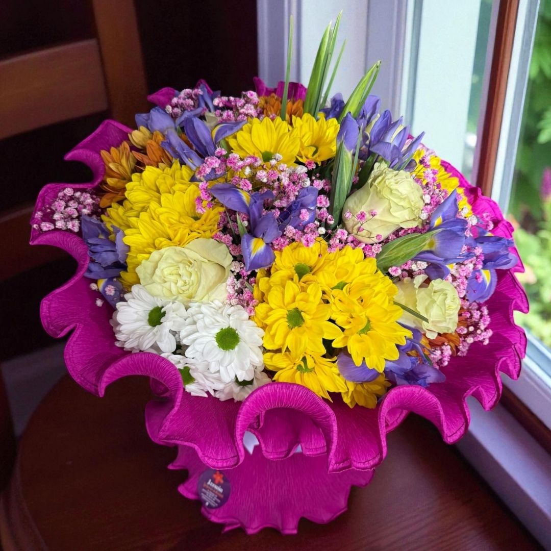 El “Energía Floral” está compuesto por una mezcla vibrante de margaritas amarillas, lirios morados, rosas blancas y paniculata rosa, creando una armonía visual que transmite optimismo y vida.
