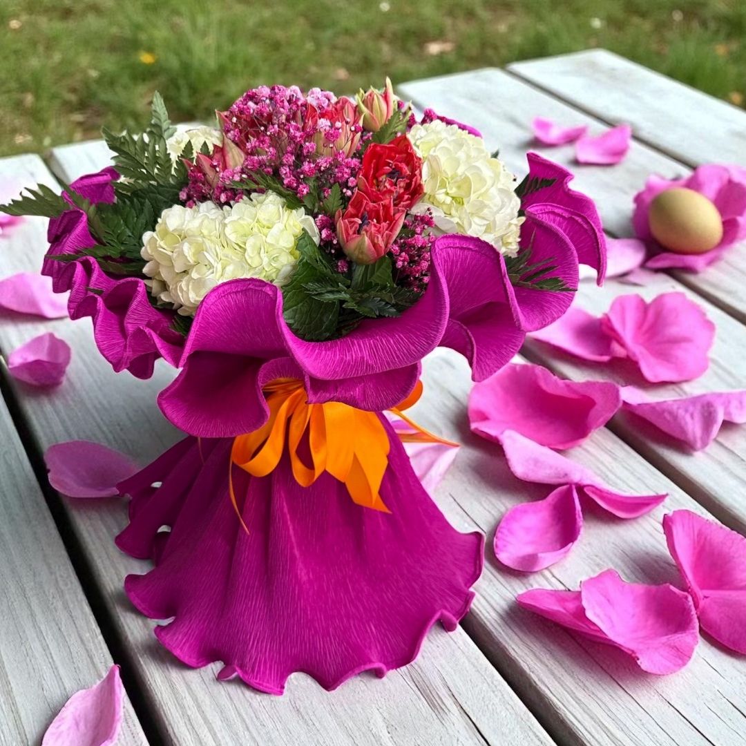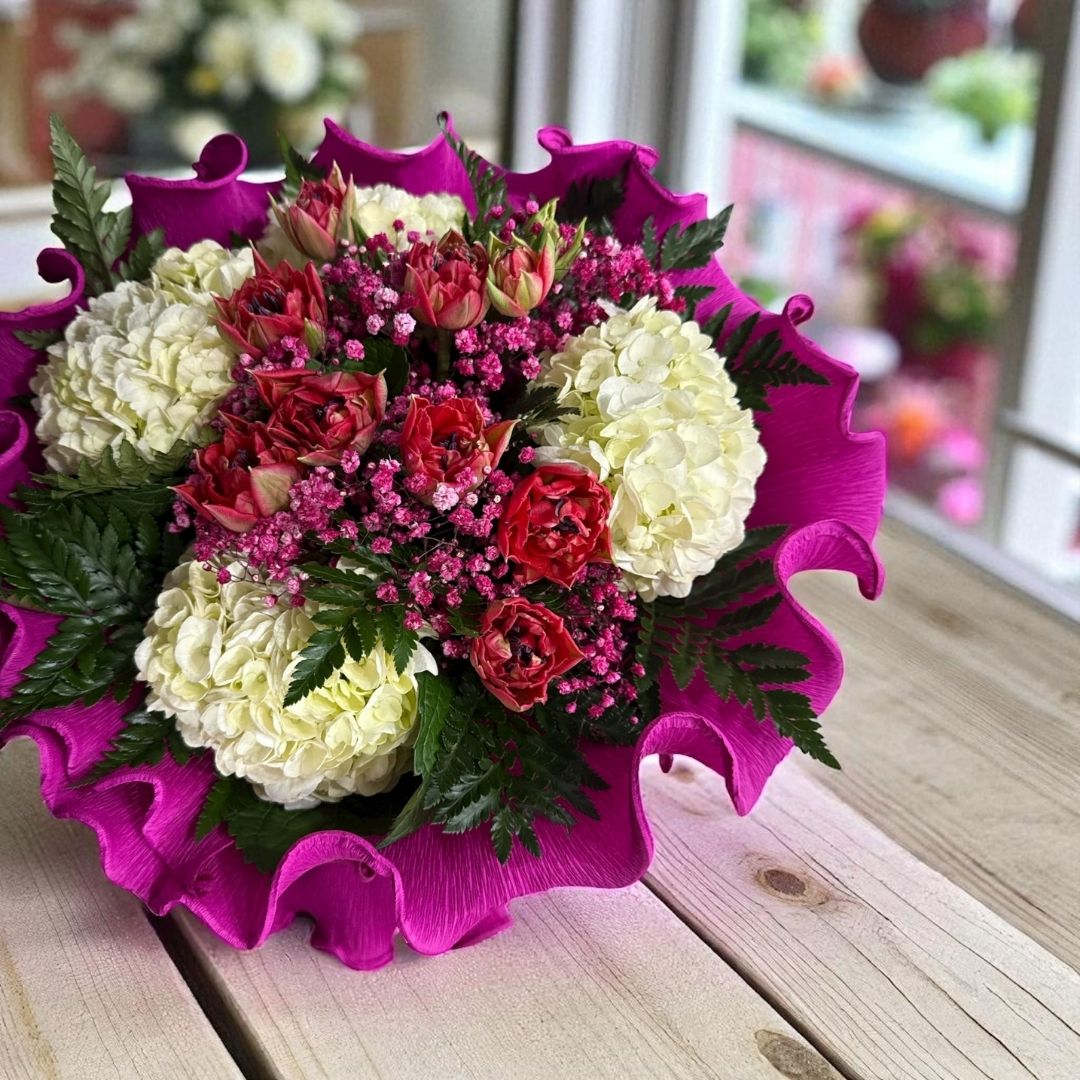 El Ramo Fucsia Glamour es una combinación irresistible de elegancia y energía. Sus tulipanes rosados destacan entre hortensias blancas y paniculata fucsia, creando un contraste delicado pero lleno de vida. El envoltorio fucsia con lazo naranja realza la frescura del conjunto y le da un toque contemporáneo y vibrante.