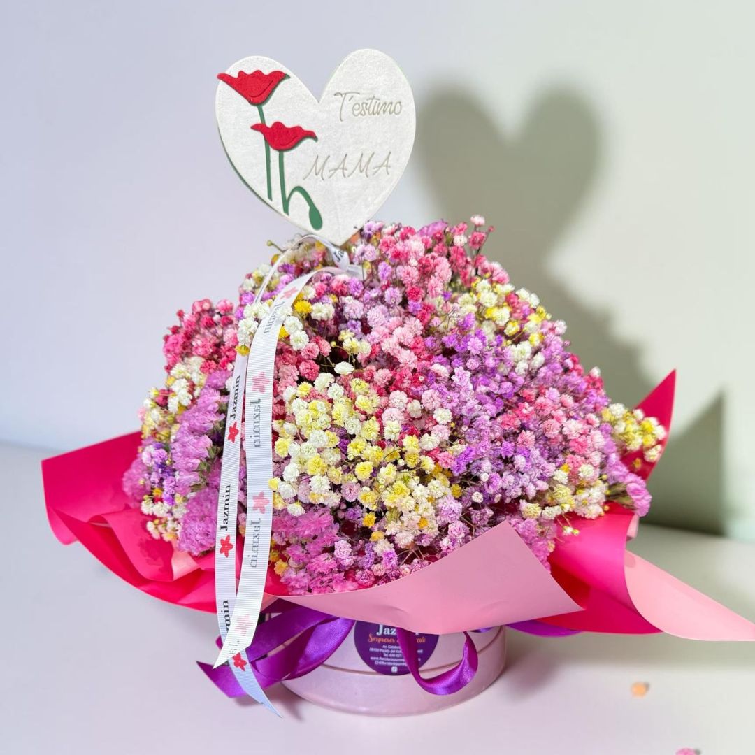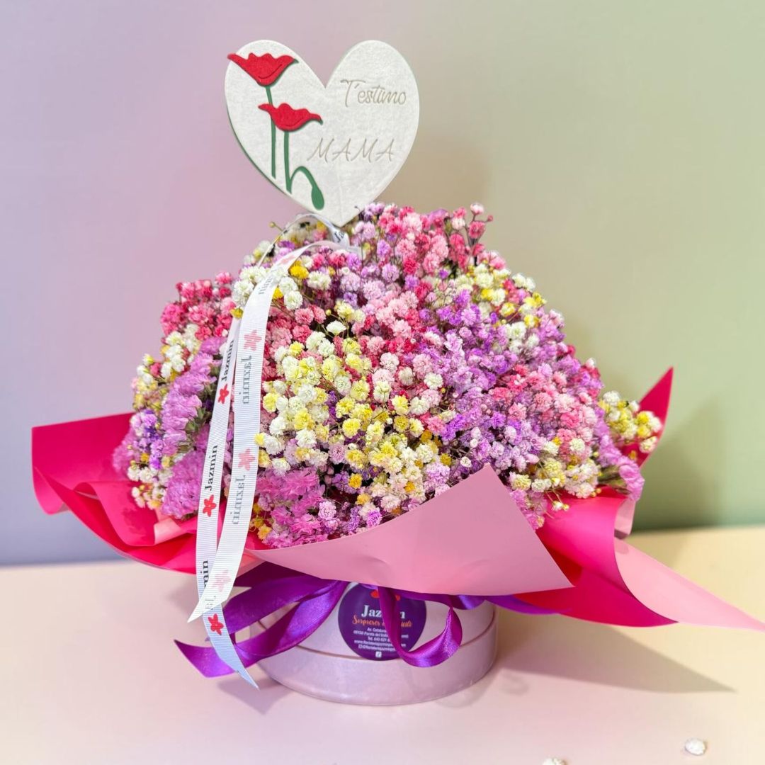 Este ramo en forma de nube combina paniculata en tonos rosa, blanco y pastel, creando un efecto suave, delicado y súper especial. Incluye dedicatoria “Te quiero mamá”, convirtiéndolo en un regalo perfecto para emocionar en su día.