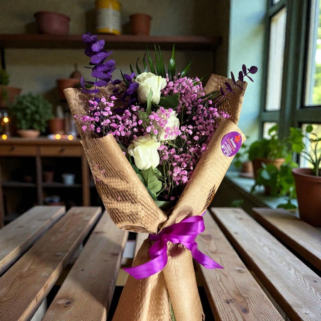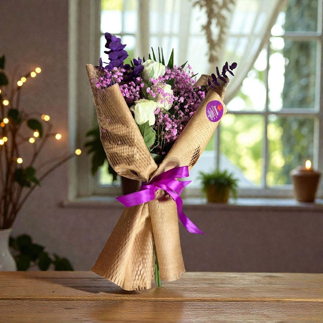 Delicado, suave y romántico. Con rosas blancas y paniculata rosa envueltas en papel kraft trabajado a mano, este ramo transmite calma, dulzura y cariño sincero.
