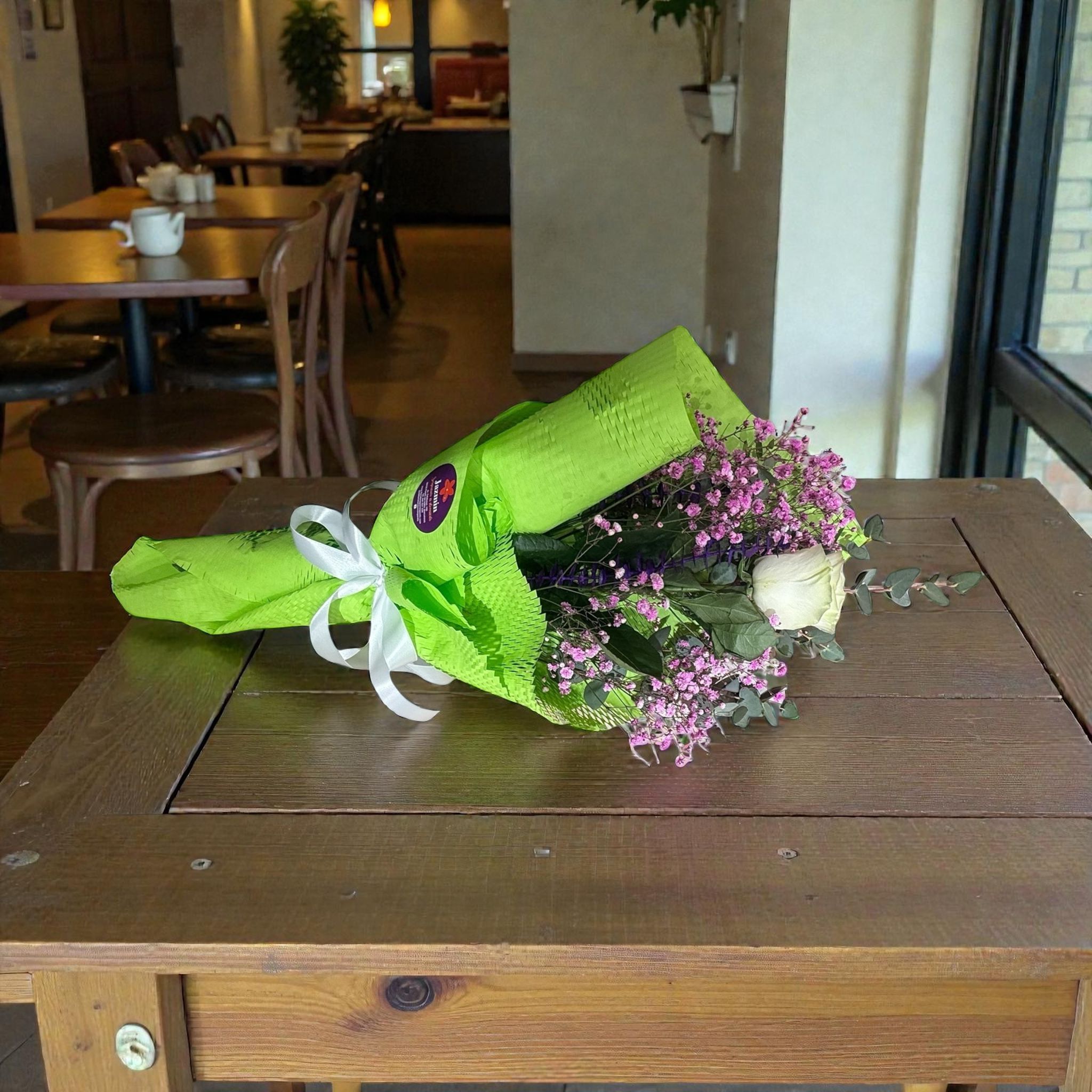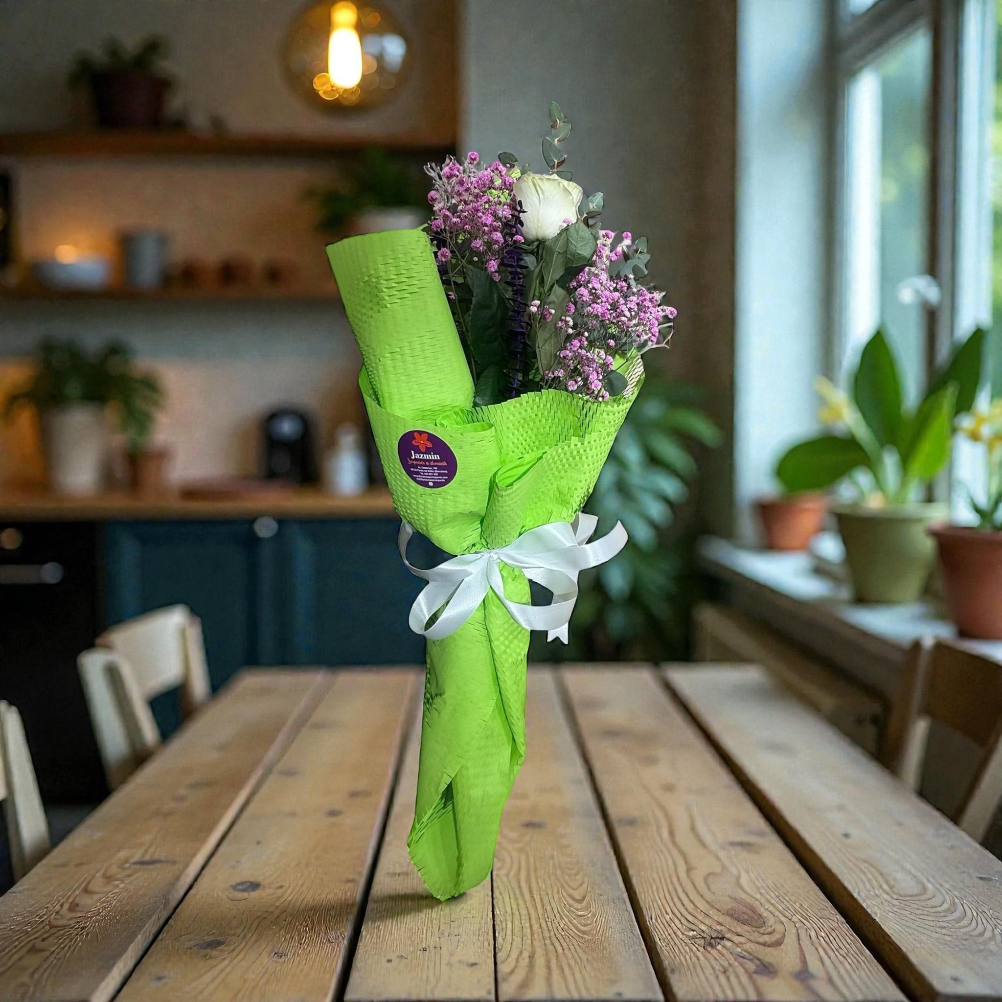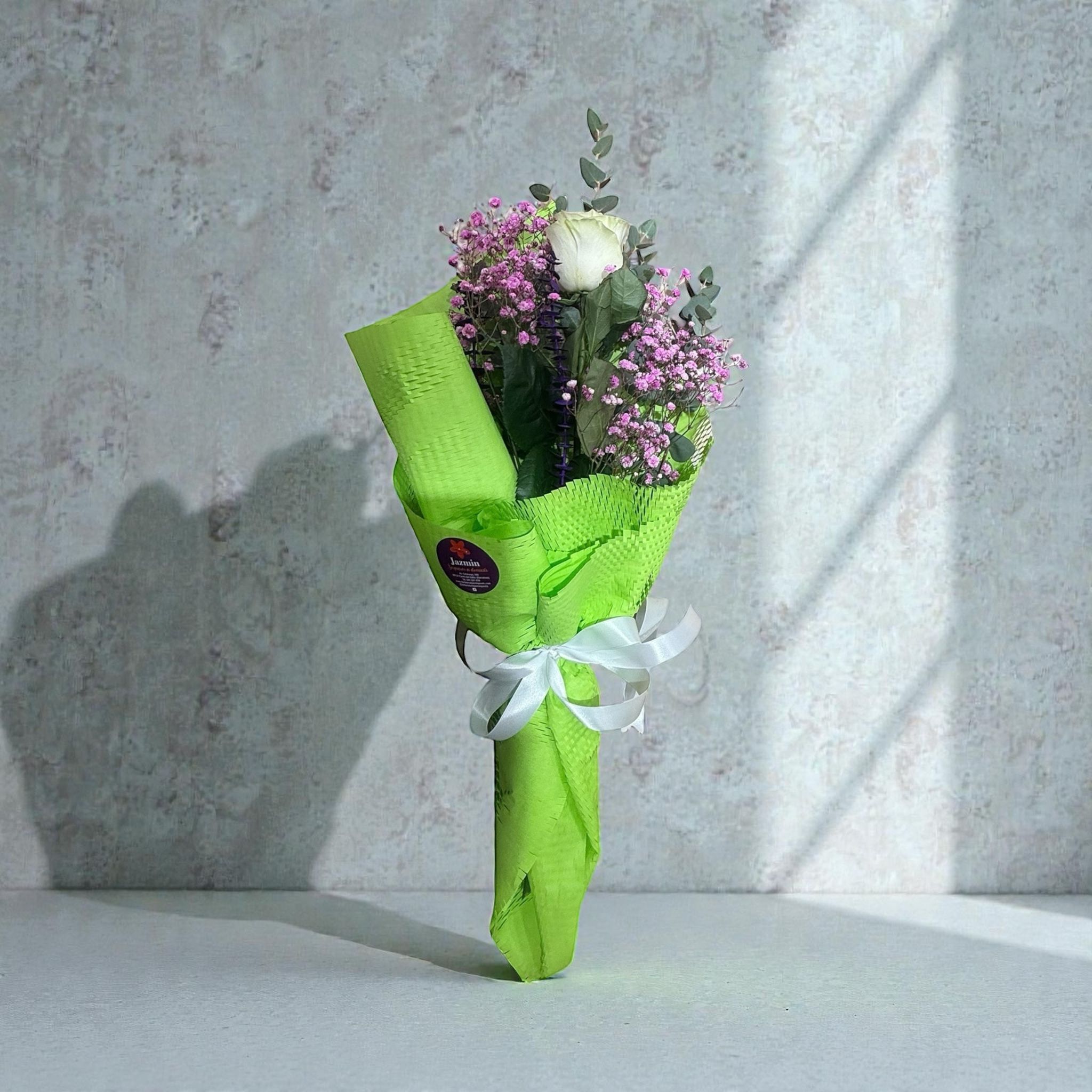 Este mini-ramo combina una rosa blanca premium, siempre elegante, con paniculata rosa y eucalipto, creando una composición suave, romántica y súper versátil para regalar en cualquier ocasión.
